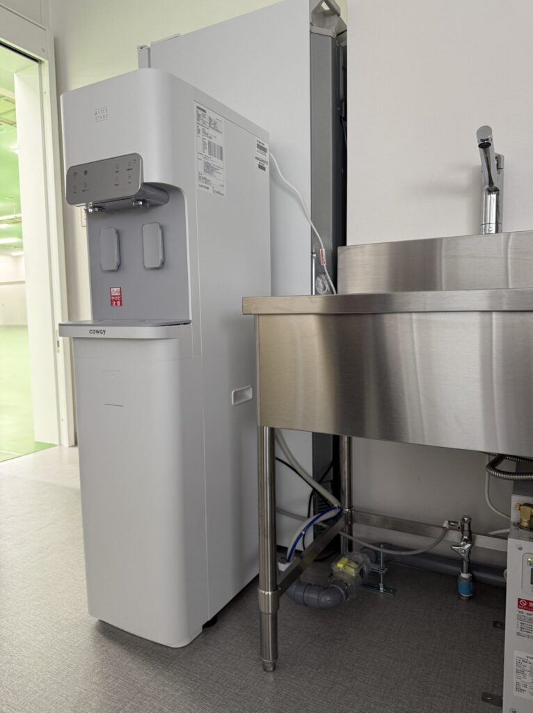 新設工場の給湯室内の給茶機に当社のエアカットバルブオールクリアのLV-50が採用されました。
