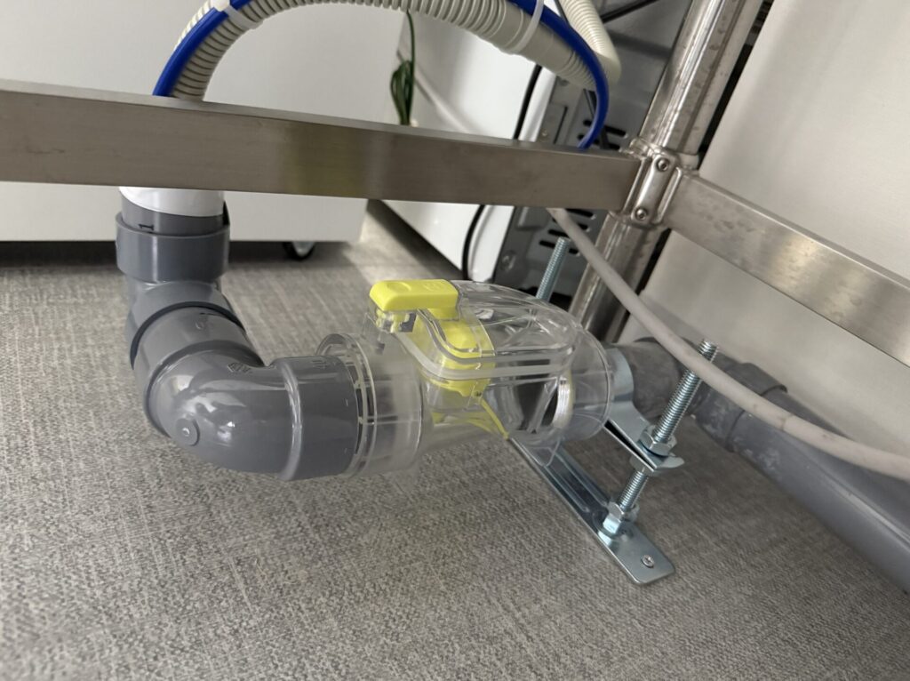 本製品は、クリアタイプであるため、内部の汚れや詰まり具合を簡単に確認でき、取り外しや清掃も容易になったことでメンテナンスの手間が大幅に削減されました。また、縦横兼用のため設置場所を選ばず、様々な給茶機に対応可能です。また、エアカットバルブは高温にも対応できるため、給茶機のように、高温の排水が発生する製品に設置することができます。