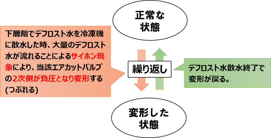 実際に、大型冷蔵倉庫の最上階につながるデフロイト排水管に設置されたエアカットバルブが、変形・破断するといった事例も発生しています。